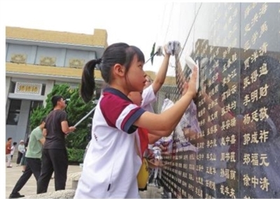 16日,学生们在市革命烈士纪念馆擦拭墓碑。