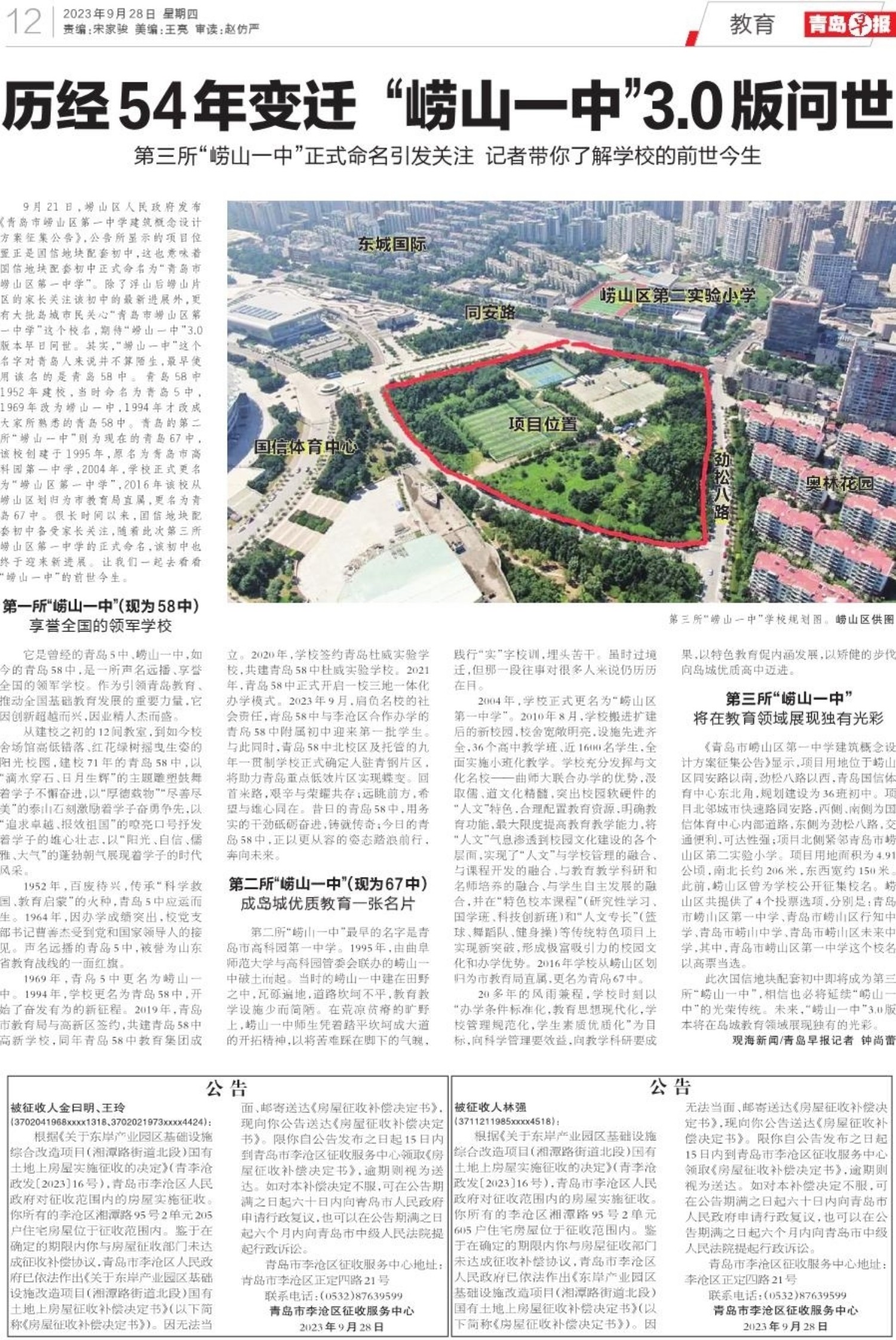 9月21日,崂山区人民政府发布《青岛市崂山区第一中学建筑概念设计方案征集公告》,公告所显示的项目位置正是国信地块配套初中,这也意味着国信地块配套初中正式命名为“青岛市崂山区第一中学”。除了浮山后崂山片区的家长关注该初中的最新进展外,更有大批岛城市民关心“青岛市崂山区第一中学”这个校名,期待“崂山一中”3.0版本早日问世。其实,“崂山一中”这个名字对青岛人来说并不算陌生,最早使用该名的是青岛58中。青岛58中1952年建校,当时命名为青岛5中,1969年改为崂山一中,1994年才改成大家所熟悉的青岛58中。青岛的第二所“崂山一中”则为现在的青岛67中,该校创建于1995年,原名为青岛市高科园第一中学,2004年,学校正式更名为“崂山区第一中学”,2016年该校从崂山区划归为市教育局直属,更名为青岛67中。很长时间以来,国信地块配套初中备受家长关注,随着此次第三所崂山区第一中学的正式命名,该初中也终于迎来新进展。让我们一起去看看“崂山一中”的前世今生。