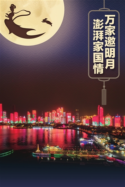 9月28日,浮山湾畔灯光秀“上新”。夜色下的浮山湾畔,流光溢彩、霓虹斑斓,玉兔、圆月、五角星等节日元素变换出现,打造出“以海为台、以天为幕、以城为景”的独特观景效果。观海新闻/青报全媒体记者 刘栋 摄