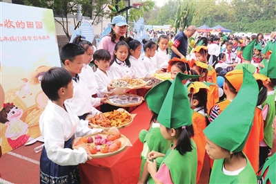 早报9月28日讯 在硕果缤纷的金秋,青岛市实验小学的同学们积极参与到“小榉叶玩转金秋”STEM+微项目课程的实践研究探索中。历经半个多月的时间,同学们走进秋天的果园、菜园、田园、花园、植物园、校园,在跨学科的融合学习中探索秋天果实的奥秘,体验收获的甜蜜,感受创造的乐趣。国庆节到来之际,同学们齐聚校园,分享、交流、展示“智·创丰收果”的主题项目研究成果,为祖国母亲的华诞献上新时代少先队员独特的生日祝福。