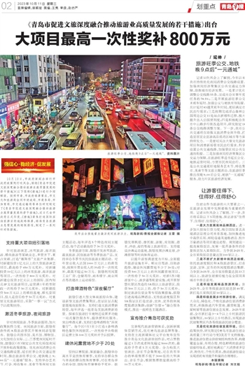 10月10日,市政府新闻办举行市政府政策例行吹风会,围绕《青岛市促进文旅深度融合推动旅游业高质量发展的若干措施》(以下简称《措施》)进行介绍解读。按照市委、市政府部署要求,市文化和旅游局会同市财政局、市商务局、市体育局、市交通运输局等单位研究制定了《青岛市促进文旅深度融合推动旅游业高质量发展的若干措施》,近日已由市政府正式印发。《措施》聚焦打造国际滨海旅游目的地战略部署,瞄准青岛旅游业急需发展的短板弱项,制定了一系列针对性措施。