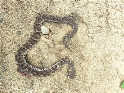 记者从徐克阳提供的照片上看到,这条短尾蝮蛇长约50厘米,头部呈三角形,尾巴很短,通体呈灰褐色,腹面灰白色,全身密布黑褐色斑点。
