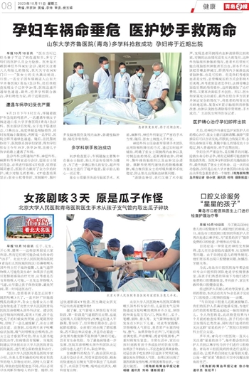 早报10月10日讯 “医生当时已经为妻子下达了病危通知书,多亏了咱们的医护人员全力抢救。医生每天都到神经外科ICU会诊,随时关注着大人和胎儿的情况,我天天守在ICU门口……”张女士的丈夫激动地说。日前,一名女子因车祸被送入山东大学齐鲁医院(青岛)急诊科,经后续检查发现女子已怀孕20周,医院迅速开通绿色通道,最终,经多学科联合救治,孕妇转危为安,将于近期出院。