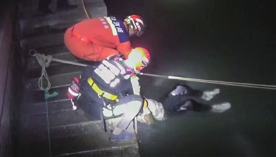 消防救援人员现场营救落水男子。