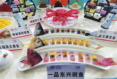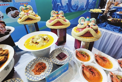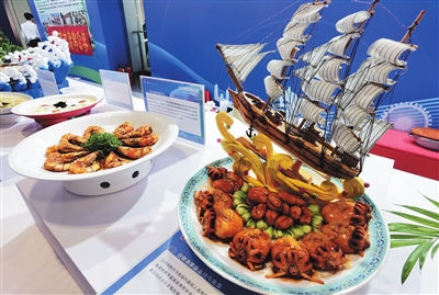 地标美食精品展——日照渔家墨鱼烧乌鱼蛋和青岛油焖海捕大虾。