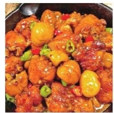 “栗子也很适合给食物添味、借味,栗子鸡、栗子烧肉、板栗粽子、栗子羹、栗子糕等,都是发扬栗子甘甜味的典范。”青岛李沧喜来登行政总厨马维涛说,栗子虽然好吃,但处理起来耗时费力。剥栗子就是个磨人的活,颇费一番工夫,但就是在这样的慢时光中,栗子却能在食物中充当关键作用。在排骨汤里放一把栗子,小火慢炖几小时,炖出来的汤又香又甜。栗子鸡是一道名菜,取其谐音还有大吉大利之意。将鸡切块后入油锅煸炒,加入老抽上色,再放入事先煮熟的栗肉,倒入生抽、盐一块焖煮。鸡肉的香味和栗子相得益彰,绝对下饭。下饭菜总给人简陋重口的印象,但这道栗子鸡却带有风雅之味。
