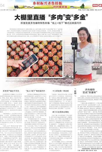 在即墨区田横镇雄崖所村的多肉繁育种植基地内,基地负责人王志忠正在每个大棚巡查管护多肉植物。田横镇持续推进农业产业结构调整,依托温室大棚发展多肉植物特色种植,建设规模型多肉繁育种植基地,并将电子商务与现代农业相结合,利用“线上+线下”销售方式,将多肉植物销往国内外,带动农民增收致富。“根据国内很多人‘宅家’的现状,我们在网络上快速推出‘订单多肉’销售模式,并改进多肉造型设计,实现所有多肉植物都可以客制化。产品一经推出,销售订单应接不暇。”王志忠说。