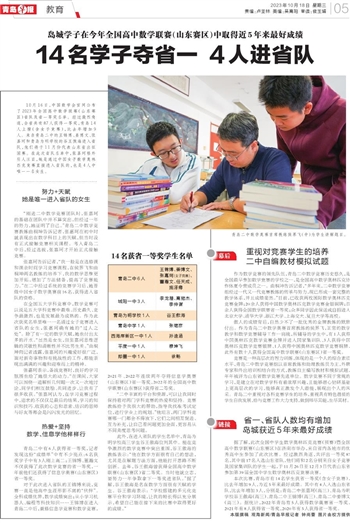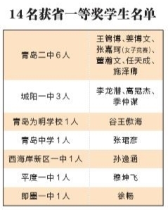 本次比赛,青岛市有14名学生获省一等奖(含女子竞赛),比去年增加9人,为近5年来最好成绩。其中有4人入选山东省队,比去年增加3人,分别是:青岛二中张嘉珂(高三)、青岛为明学校谷王傲海(高三)、青岛二中王锦博(高三)、青岛二中姜博文(高三)。据统计,2022年青岛有5人获得数学奥赛省一等奖,2021年有8人获得省一等奖,2020年有5人获得省一等奖。