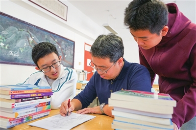 青岛二中数学奥赛首席教练侯界飞(中)为学生讲解题目。