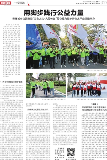健步行途中,爱心参与者除了欣赏太平山绿道沿线的风景,也代言“器官捐献”主题,通过爱心接力、健步行的方式积极宣传普及器官捐献理念和捐献知识,传递积极阳光的正能量,弘扬人间大爱,展现人性光辉,营造全社会参与支持人体器官捐献的良好氛围,推动树立奉献大爱、无上光荣的良好社会风尚。参与者还发出倡议,呼吁大家加入志愿者行列,扫码登记成为器官捐献志愿者,为挽救他人生命做贡献。“参与这次活动,让我了解了器官捐献这一公益事业的伟大,我准备把这份爱心知识普及给家人、朋友。”来自青岛二中的学生王丽说。