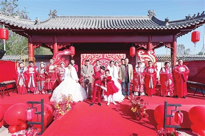 活动现场喜气洋洋、热闹非凡。仪式采用古典婚礼场景,在五千年历史的莱夷古乐演奏下,再现了汉代礼仪与婚庆文化。七对新人身穿端庄秀美的传统中式婚服,遵循古礼,步履优雅地缓缓走来。整衣簪花、共登喜堂、三梳三拜,行合卺礼、结发礼、执手礼……同时,为两对历经风雨共患难、白首同心永相伴的恩爱夫妻恭贺金婚、银婚,为他们送上最美好的祝福。