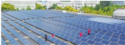 即墨区供电公司党员服务队进企业检查屋顶光伏并网发电设备。