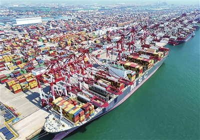 在山东港口青岛港,货轮在码头装卸货物。 张进刚 摄