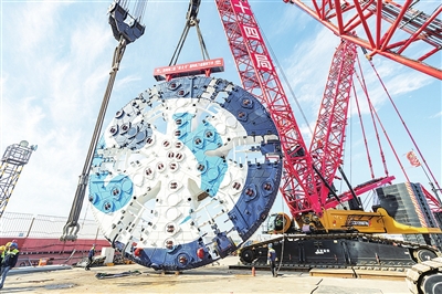据悉,盾构机抵达项目施工现场后,就开始了安装调试工作。目前已完成盾构机安装工作的90%。“刀盘是盾构机最重要的部件,也是最大的单体部件。此次要安装的刀盘重达600吨,虽然需要移动的距离很短,但考虑到是超大部件,对安全性和稳定性的要求较高,项目部提前多次筹划,研究吊装方案。”赵振宁介绍,最终决定采用两台履带吊协同作业方式,其中一台为800吨,另一台为400吨。经过数小时起吊、移位和下放,最终,刀盘和机身稳稳契合在一起。