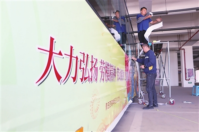 青岛真情巴士工作人员对工会主题宣传巴士的车体进行装饰。