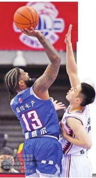 上海久事队球员袁堂文(右)在比赛中防守青岛国信水产队球员鲍威尔投篮。 新华社发