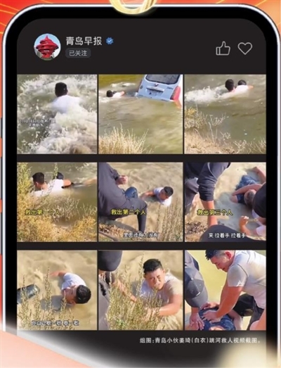 组图:青岛小伙姜琦(白衣)跳河救人视频截图。