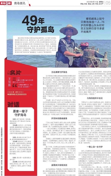 1947年8月出生的王加辉,是青岛市即墨区田横岛省级旅游度假区山东头自然村村民。他先后获得青岛市“文明市民”、“山东好人”、“感动青岛”道德模范称号,荣登2023年第三季度“中国好人榜”。位于即墨区的赭岛是田横岛的前哨,地理位置重要。1974年,驻岛部队撤防后,山东头村动员村民护岛,村里明确规定,护岛是义务,没有报酬。王加辉主动请缨,带着妻儿义无反顾登上了赭岛。一朝上岛,一生守护。49年来,王加辉的脚印遍布岛上的每一寸土地,他以单薄的肉躯抵挡着惊涛骇浪,用无怨无悔的坚守,兑现着对党和祖国的庄严承诺。
