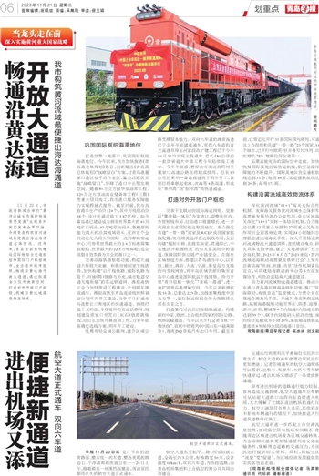 11月20日,市政府新闻办举行“黄河流域生态保护和高质量发展”主题系列新闻发布会第四场,介绍青岛构筑黄河流域最便捷出海达海通道总体情况。近年来,青岛全面加快建设国际性综合交通枢纽和国际门户枢纽城市,全力提升城市能级,畅通沿黄达海开放大通道,通过拓展全方位开放新空间,打造对外开放门户枢纽,构建沿黄流域高效物流体系。