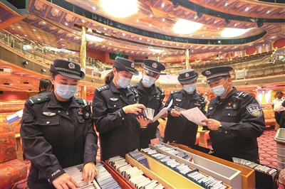 边检民警登船为船员办理通关手续。 观海新闻/青报全媒体记者 梁超 摄