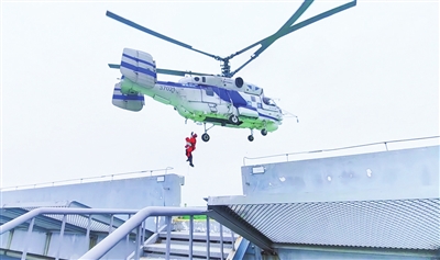 消防直升机救援“被困”人员。观海新闻/青报全媒体记者 梁超 摄