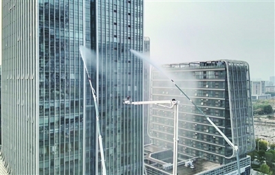 消防救援人员对高层“失火”现场实施扑救。
