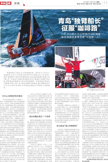 孤独的海上之旅之后,纪录连着纪录。2023年11月24日,当地时间15点11分50秒(北京时间25日凌晨3点11分50秒),青岛“独臂船长”徐京坤和搭档Mike Golding驾驶着中国梦之队“海口号”,冲过位于加勒比海马提尼克法兰西堡的“咖啡路”终点线,顺利完成咖啡路双人跨大西洋帆船赛。34岁的徐京坤成为“咖啡路”历史上第一位入选并完赛的中国船长,整个赛程时间为17天10小时41分50秒,以平均对水航速12.9节航行了5400海里。