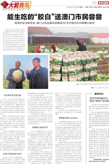 “我们会与澳门街坊总会、澳门扶康会一起,通过赠送的方式来推广‘好品山东’品牌——胶州大白菜,让澳门市民品尝到山东的特产。澳门市民食用胶州大白菜的时候,可以用粤菜的烹制方式,味道一定会非常好。”冷垚介绍,他们在澳门推广胶州大白菜时,也会把山东的烹饪方法教给澳门市民,让大家一起来品尝口味独特的胶州大白菜。