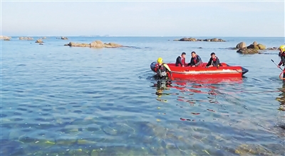 消防救援人员驾舟救援被困在礁石上的3名海钓爱好者。