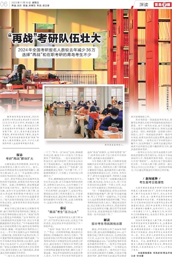教育部官网发布消息称,2024年全国硕士研究生招生考试将于2023年12月23日至25日举行,考试报名人数为438万。这一报名人数为自2015年以来连续8年考研报名人数增长后的首度下降。近日,青岛早报记者在多所高校、考研培训机构了解到,因去年“首战”失利而选择重回考场“再战”的考生人数有所增加,此外,不少已入职场的年轻人也选择考研提升学历。