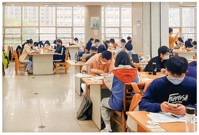 近日,青岛早报记者在岛城多所高校的图书馆看到,奋笔疾书的考生坐满了座位。走廊上和楼梯间,到处都是拿着书本复习的考生。据多位应届考生反映,虽然今年全国考研人数下降,但没从身边的考研群体中感觉压力变小。中国海洋大学大四学生赵嘉晋表示,“每天在图书馆里复习的人很多,不仅有应届生,还有很多再次参加考试的师哥师姐。”