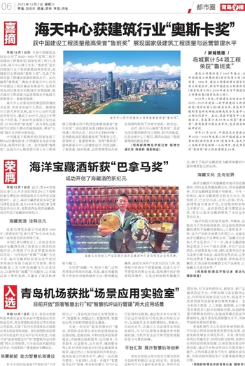 今年11月28日,中国建筑业协会公布2022—2023年度第二批中国建设工程鲁班奖(国家优质工程)获奖名单,海天中心为榜单中岛城唯一入选项目,使我市获得“鲁班奖”的工程数量增至54项。