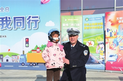 青岛交警高新区大队的民警给小朋友戴上安全帽。
