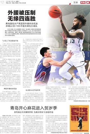 最后一节,天津队以一波8∶0将分差拉大到16分。在双外援均不在状态的情况下,青岛队主帅刘维伟干脆在第四节选择全华班与对手周旋。虽然队员们拼尽全力,但最终还是以83∶100败下阵来。