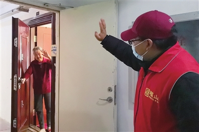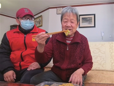 上图:老人品尝订购的饭菜。 左图:老人跟配送人员告别。