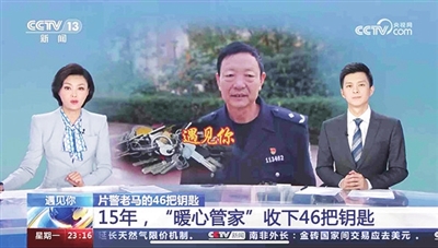 马怀龙:这46把钥匙一共重798克。我在社区里每天拿着钥匙走来走去,很多居民问我,马警官你每天拿着这么多钥匙不累吗?我说不累,但是很沉。沉的是责任、是信任,沉的是家门到心门割舍不断的距离。各级领导、家人、同事和我们志愿服务队的队员,他们一直都在帮助我、支持我。这些钥匙很沉,但是有了大家爱的凝聚,有了大家的共同托起,才让我拿得动这一把把钥匙。接到一把钥匙,就表明老百姓把这个家交给我了,这是一个长期的过程。钥匙的意义在于,这是一种爱的凝聚、爱的传递,只要老百姓信任我,我就会把这些钥匙永远地管下去,把这些家庭永远地守护下去。