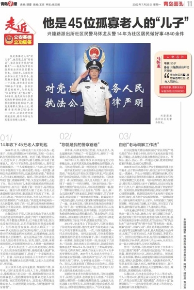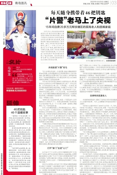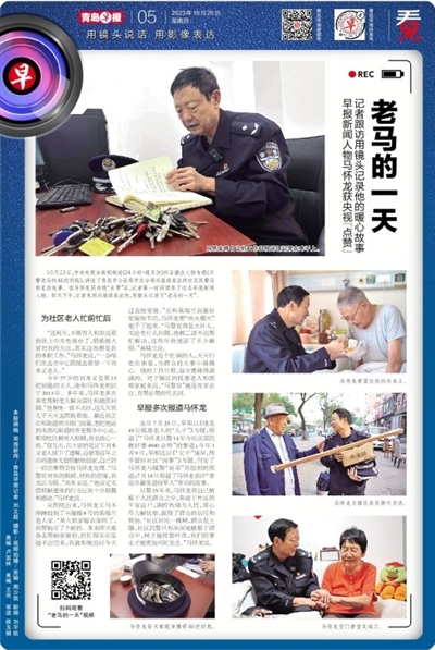 其实,马怀龙早就是青岛早报的新闻人物了。去年7月25日,青岛早报曾以《他是45位孤寡老人的“儿子”》为题,报道了“马怀龙从警14年为社区居民做好事4840余件”的事迹;今年1月9日,青岛早报以《“父子”情深,携手管好社区“闲事”》为题,刊发了马怀龙与辅警“徒弟”孙国相的报道;7月18日,青岛早报报道了马怀龙获评“青岛市最美退役军人”背后的故事;10月25日、26日,青岛早报记者连续两天跟访马怀龙,推出《“片警”老马上了央视》《老马的一天》全媒体报道。