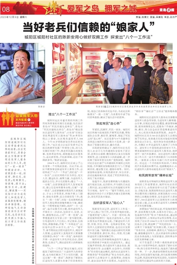 在城阳区城阳街道城阳村社区经常能看到这样的场景:社区党委副书记、居委会副主任陈新安带领退役军人服务站的工作人员,进行“一家一联系”的联谊活动。大家围坐在一起,拉家常、聊近况、谈收获;视频聊天,询困难、谋方法;微信互动,谈建议、解政策……用实际行动为退役军人和现役军人家属排忧解难,增添幸福指数。这种贴地气互动场面在该社区时常见到,也是该社区把双拥工作融入到日常工作的真实缩影。