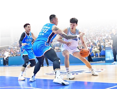 青岛队小将杨瀚森(白衣)在与山东队比赛中运球突破。 观海新闻/青报全媒体记者 王雷 摄