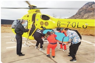 但由于天气寒冷,加上航路有雨和低云,直升机随时可能因结冰返航。市急救中心与直升机机组第一时间合理评估风险,协调申请急救航线,适时启动航空医疗救援。15时02分,H135直升机载着两名医务人员从市急救中心起飞,15时15分,直升机到达指定地点后,载着患者立即飞往市立医院东院,15时40分安全抵达。途中医务人员严密监护病人生命体征,同时提前向接收医院发出预警,市立医院东部院区开通绿色通道,尽最大可能缩短救治时间。