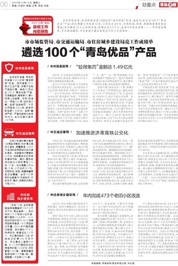 全市学校食堂、养老机构食堂100%达到“清洁厨房”标准,遴选92家企业100个“青岛优品”产品;优化调整公交线路72条、公交站点267处,实现机场、铁路、商圈等重要枢纽全覆盖;年内建成72个公共停车场,新增泊位2.5万个,连续4年居全省第一……市市场监管局、市交通运输局、市住房城乡建设局亮出今年工作成绩单。