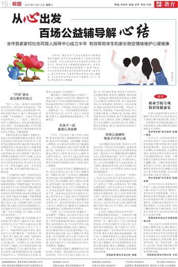 近年来,“家校合作”已成为岛城各区市教育探索的关键词,各中小学也纷纷展开了家校社协同育人的实践。近日记者来到市北区家校社协同育人指导中心、市北区学生心理健康发展服务中心、市北区中小学幼儿园家长学校总校(简称“心育家”)探访,作为全市首家实体化运行的家校社协同育人指导中心,成立半年以来,已连续开展近百场次公益心理辅导,为160位学生和家长进行个体辅导,从“心”出发,护航青少年心理健康。
