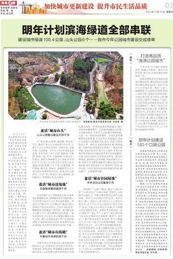 围绕“12131”公园城市建设三年攻坚行动系统工程,口袋公园、林荫廊道、生态绿化工程已提前完成目标,滨海绿道、综合公园(社区公园)、立体绿化、古树复壮等工程正按计划组织实施。2024年,青岛市公园城市建设计划建设项目78个,计划实现滨海绿道全部串联,完善太平山中央公园、浮山森林公园服务功能,建设综合公园(社区公园)18个,口袋公园140个、林荫廊道35条、立体绿化86处,完成森林质量精准提升1万亩,复壮濒危古树名木150株。将重点结合城市微更新,充分挖掘老城空间,居住小区的散乱空地、拆违治乱的腾挪空地、立交桥桥下空间、长期闲置地等城市边角隙地,探索多种建设途径,谋划口袋公园建设。将持续推进“公园+”功能体系,逐步实现公园的业态升级,为市民提供更加丰富的公园体验。 本版撰稿 观海新闻/青岛早报记者 刘文超