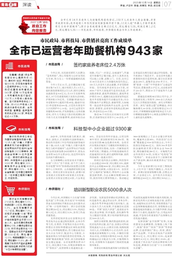 全市已有18万名老年人与助餐机构签约登记,150万人次老年人前去就餐,并享受政府补贴;我市连续三年位列国家创新型城市前十强,12次入选“外籍人才眼中最具吸引力的中国城市”;预计全系统销售总额210亿元、同比增长5.5%,利润总额1.2亿元、同比增长5.3%……市民政局、市科技局、市供销社亮出今年工作成绩单。