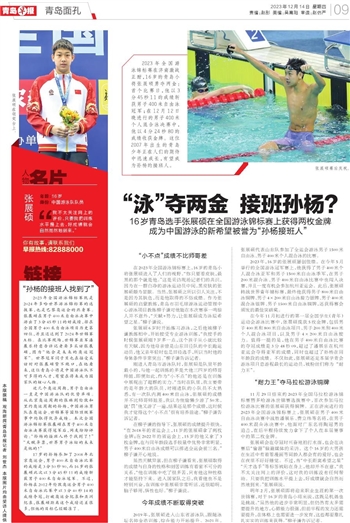 2023年全国游泳锦标赛在济南激战正酣,16岁的青岛小将张展硕勇夺两金:首个比赛日,他以3分45秒11的成绩斩获男子400米自由泳冠军;在12月12日晚进行的男子400米个人混合泳决赛中,他以4分24秒80的成绩收获金牌。这位2007年出生的青岛少年正在人们的期待中迅速成长,有望成为孙杨的接班人。