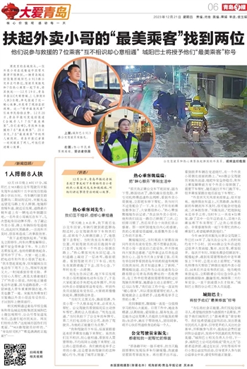 寒夜里的岛城街头,一位外卖小哥在送餐途中因雪天路滑不慎摔倒,一辆青岛城运控股集团城阳巴士913路公交车正巧路过,驾驶员宋振先和7位热心乘客一起下车,将其扶起……12月19日,青岛早报以《天寒情暖,1人摔倒8人扶》为题,率先报道了这一暖心故事,并发布了现场监控视频。这一“雪中最美风景”引来市民纷纷点赞。12月20日,青岛早报刊发追踪报道《全城寻人!7位“最美乘客”,你们在哪》,寻找参与救援的7名“最美乘客”。20日当天,7名“最美乘客”中的两人被找到。青岛早报记者第一时间联系了两人,听他们讲述暖心故事。