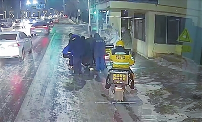“那天晚上8点多,我下班后坐公交车回家,车辆行驶到蔚蓝群岛附近时,公交驾驶员停下车和我们说,前面有个人摔倒在路上了,他想要下去帮忙。当时我坐在车厢后门位置,听到驾驶员的话后跑到车前门查看,发现有一个外卖小哥倒在路上。”热心乘客刘先生回忆道,当时道路上凝结了一层冰雪,路面很滑。看到驾驶员开门下车后,刘先生也紧跟着跑了下去,因为心急,下车时也差一点滑倒。