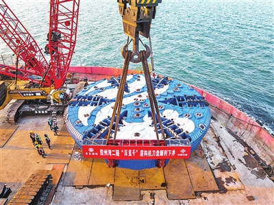 胶州湾第二隧道工程“深蓝号”盾构机刀盘下井。