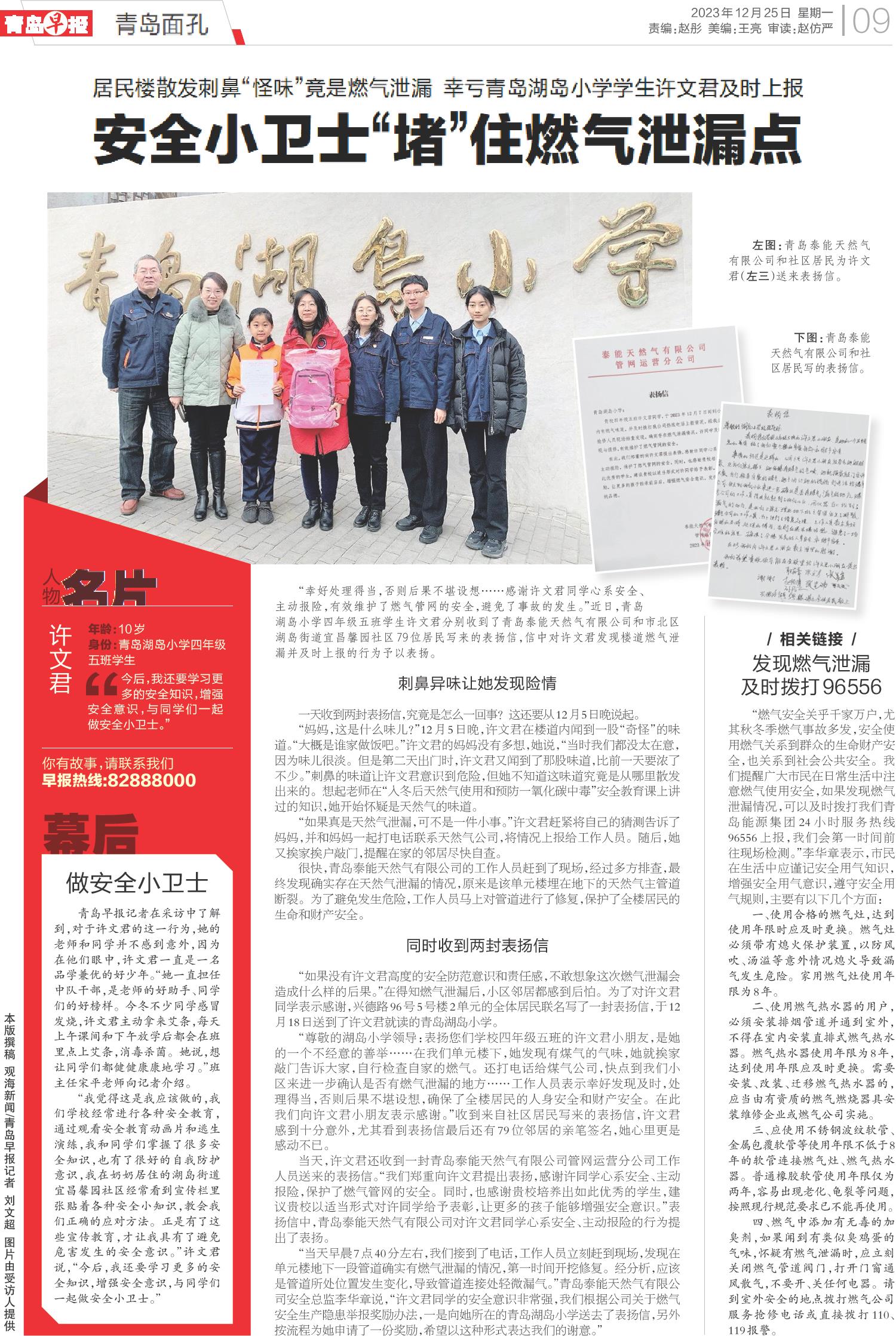 “幸好处理得当,否则后果不堪设想……感谢许文君同学心系安全、主动报险,有效维护了燃气管网的安全,避免了事故的发生。”近日,青岛湖岛小学四年级五班学生许文君分别收到了青岛泰能天然气有限公司和市北区湖岛街道宜昌馨园社区79位居民写来的表扬信,信中对许文君发现楼道燃气泄漏并及时上报的行为予以表扬。