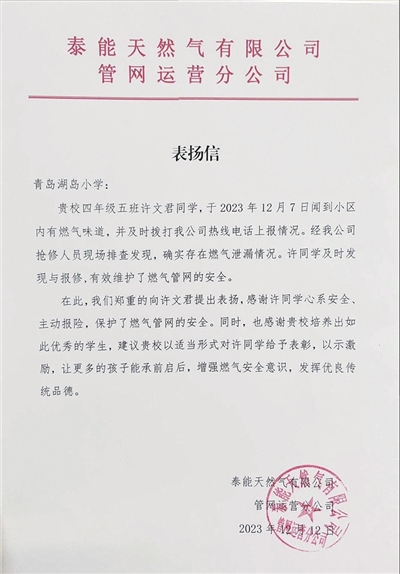 当天,许文君还收到一封青岛泰能天然气有限公司管网运营分公司工作人员送来的表扬信。“我们郑重向许文君提出表扬,感谢许同学心系安全、主动报险,保护了燃气管网的安全。同时,也感谢贵校培养出如此优秀的学生,建议贵校以适当形式对许同学给予表彰,让更多的孩子能够增强安全意识。”表扬信中,青岛泰能天然气有限公司对许文君同学心系安全、主动报险的行为提出了表扬。
